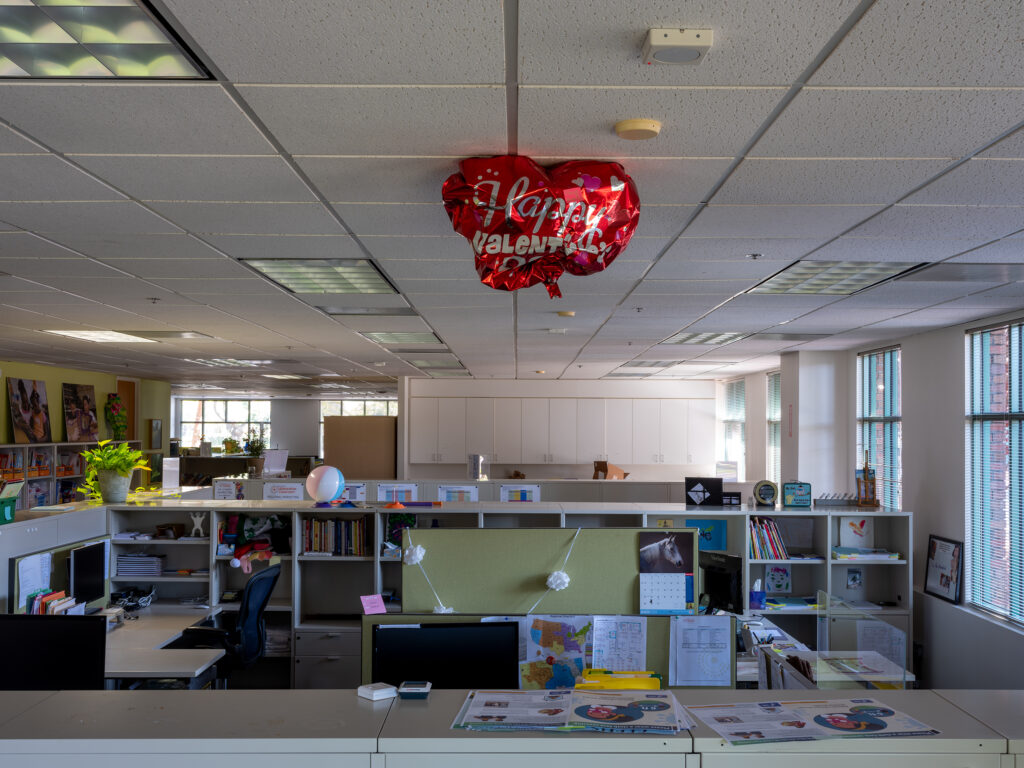 Later in the project he added color photographs, made with a medium format camera on a tripod. In these formally made photos he started to shoot offices that were empty due to the stay at home order.
