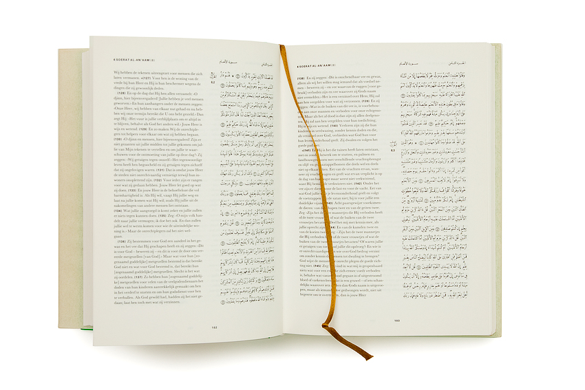 In this edition of the Koran, the Dutch translation by Fred Leemhuis is placed next to the Arabic text. In his translation, Leemhuis wanted to take into account the authoritative character the book has for Muslims. This makes this edition of the Koran, which was also presented to the Azhar University of Cairo for approval, suitable for Muslims.